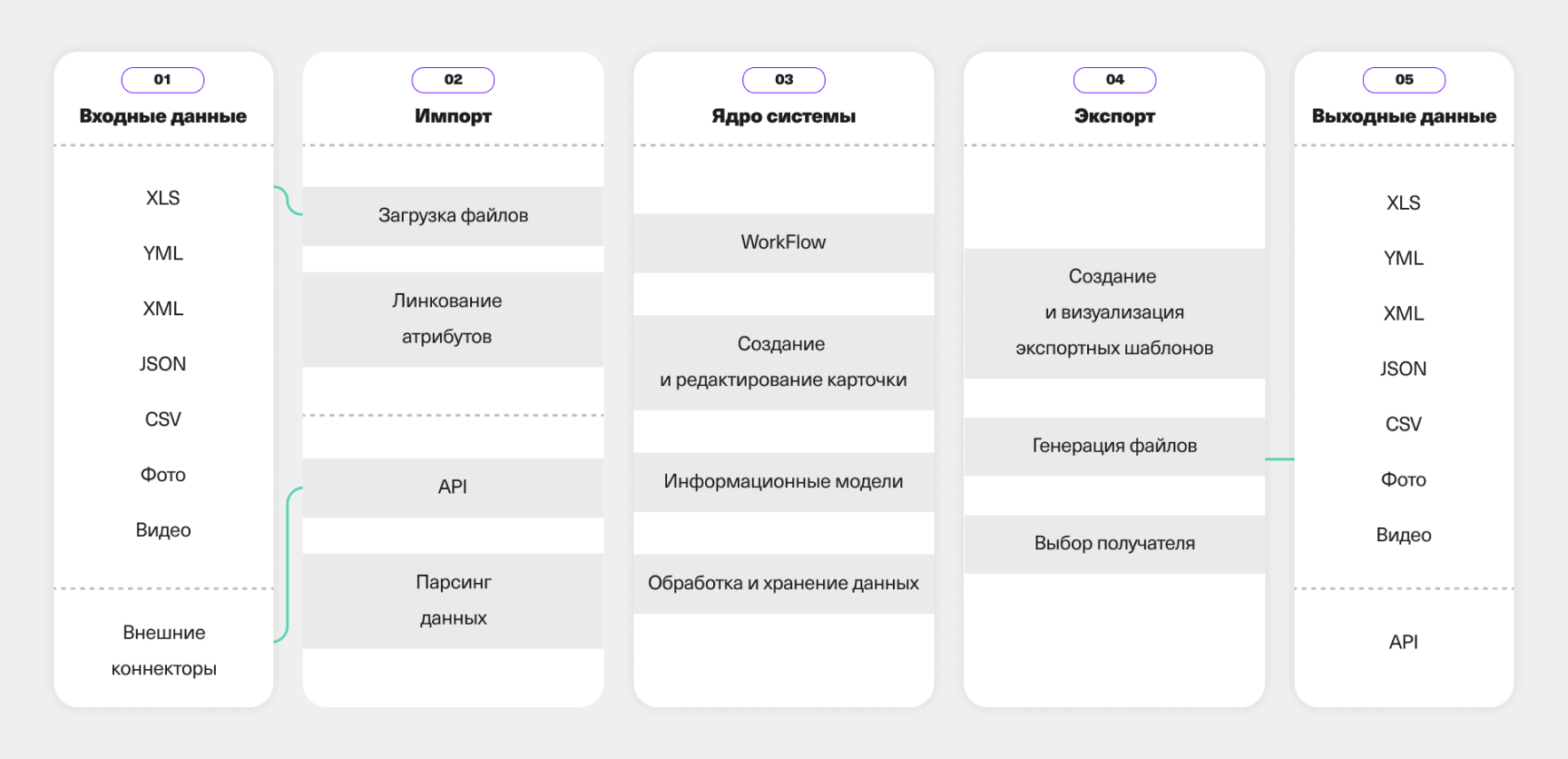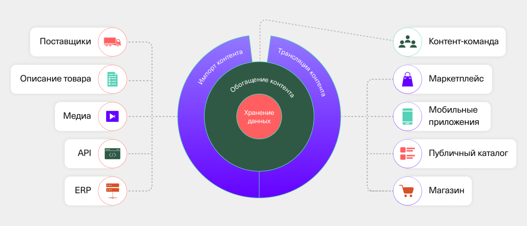 Существует различные форматы данных PIM системы, которые необходимы для товара на протяжении всего жизненного цикла продукта в e-commerce. ПИМ-система обеспечивает работу с информацией о продукте и способна обрабатывать входящий, исходящий поток различных видов товарного контента для различных каналов продаж: